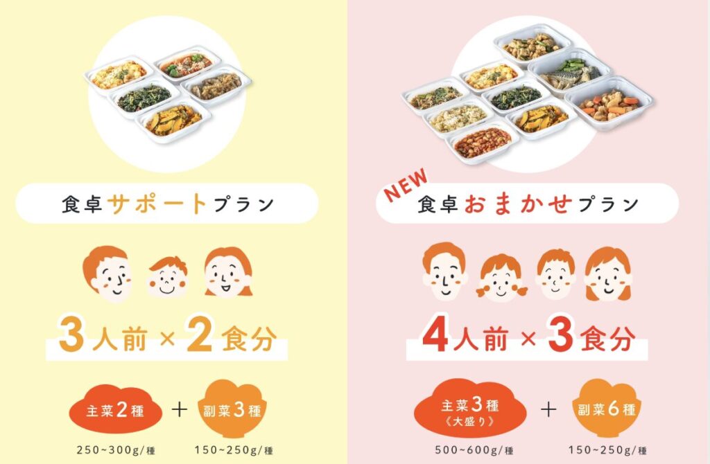 3人家族で2食分食べられる「食卓サポートプラン」、4人家族で3食分食べられる「食卓おまかせプラン」です。