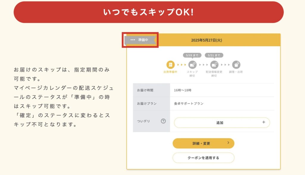 お届け週の前週月曜日23時59分までに手続きが必要となること、スキップは1回のスキップに対して配送1回分のみ配送停止となる点にご注意ください。