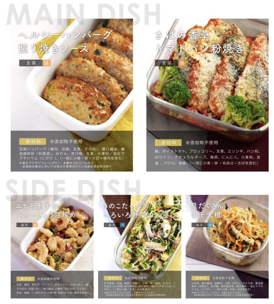 100種類以上あるメニューの全ての紹介はありませんでしたが、メインディッシュとサイドディッシュの一例、原材料名が提示されているため、「こんな感じのものが届くのかな」とイメージを膨らませつつ、楽しみに待つことができるでしょう。