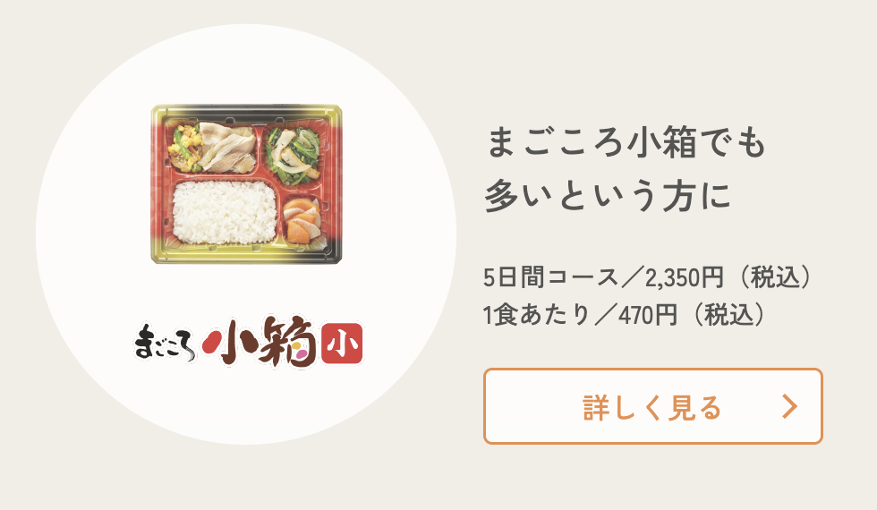 | まごころ小箱(小) | 白米+おかず3品 | 2,350円 | 470円 |